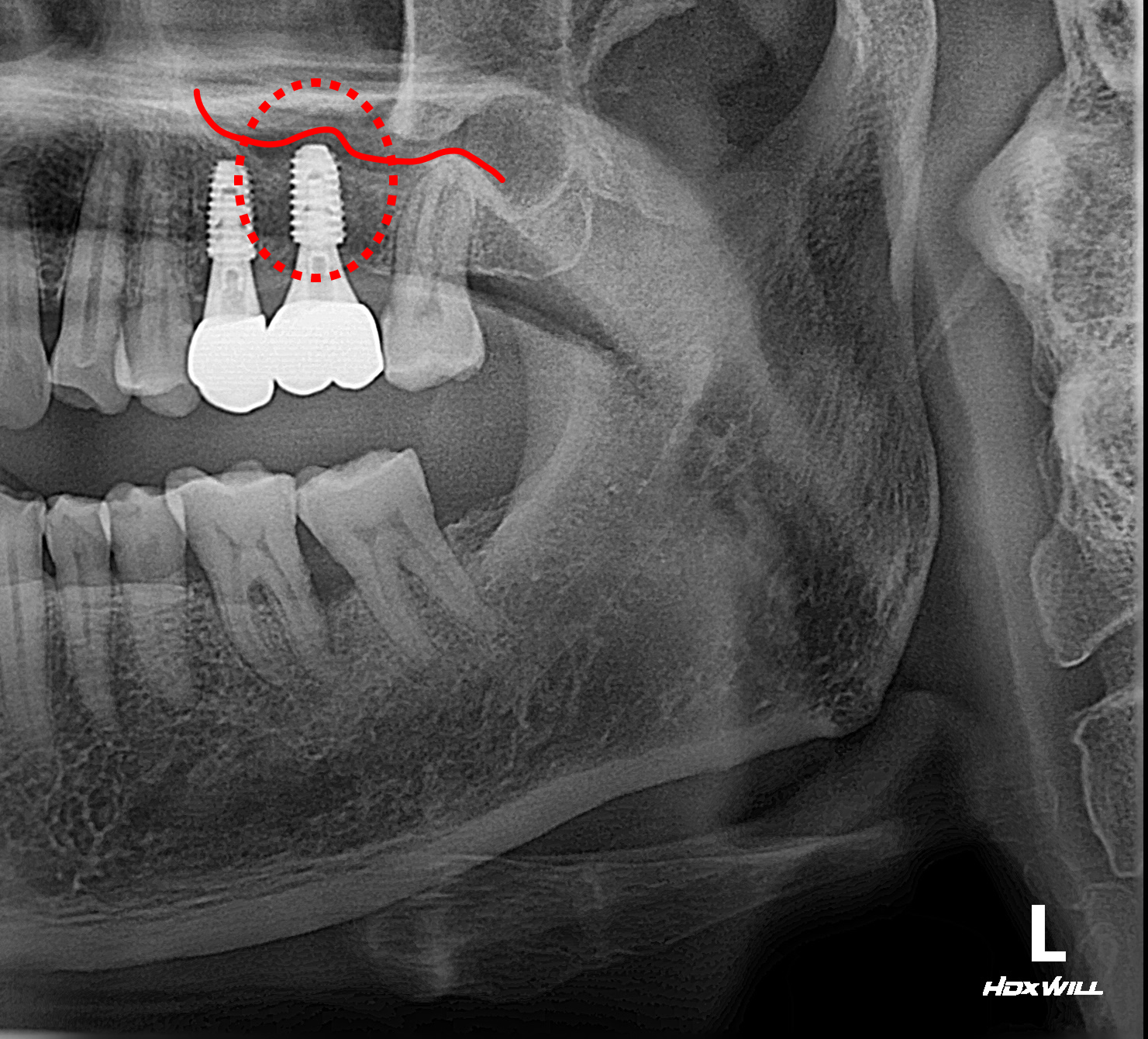 하지만 상악(위턱) 어금니 부위는 해부학적으로 '상악동'이라는 공기 주머니 형태의 빈 공간이 존재하여 본래 잔존골의 두께가 얇은 편입니다. 이에 더해 환자분은 이전의 심한 염증으로 인한 골흡수까지 겹쳐, 임플란트를 지지할 치조골이 절대적으로 부족한 상태였습니다.