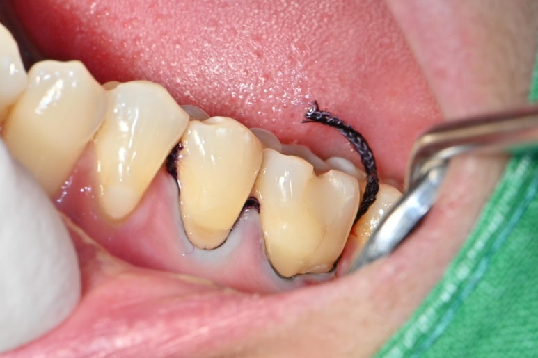 그후에 사진에 보이는 검정 실인 징지코드를 넣습니다. 징지코드는 잇몸 하방에서 올라오는 삼출물이나 혈액을 억제하는 효과가 있습니다.